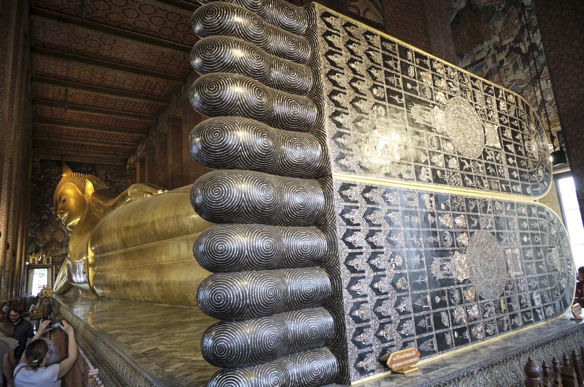 Below is a reclining Buddha from Wat Phra, covered in gold leaf. His feet are decorated with mother of pearl inlay. Hard to get a picture without being 100 feet away! (no pun intended)