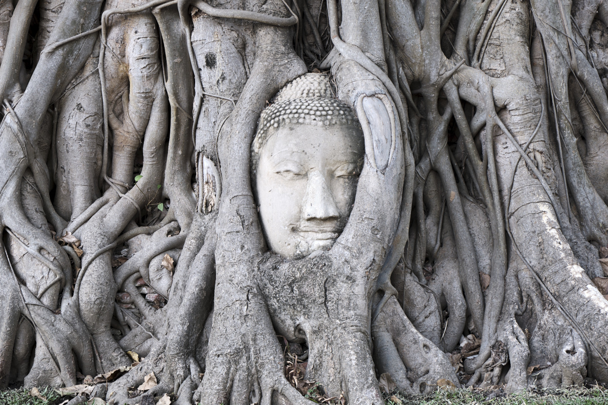 Many years ago, thieves stole many of the statues, or if the statues were too large, they would take just the head. In this case, someone set a stolen head next to a tree, then forgot it or left it behind. And nature took it’s course.