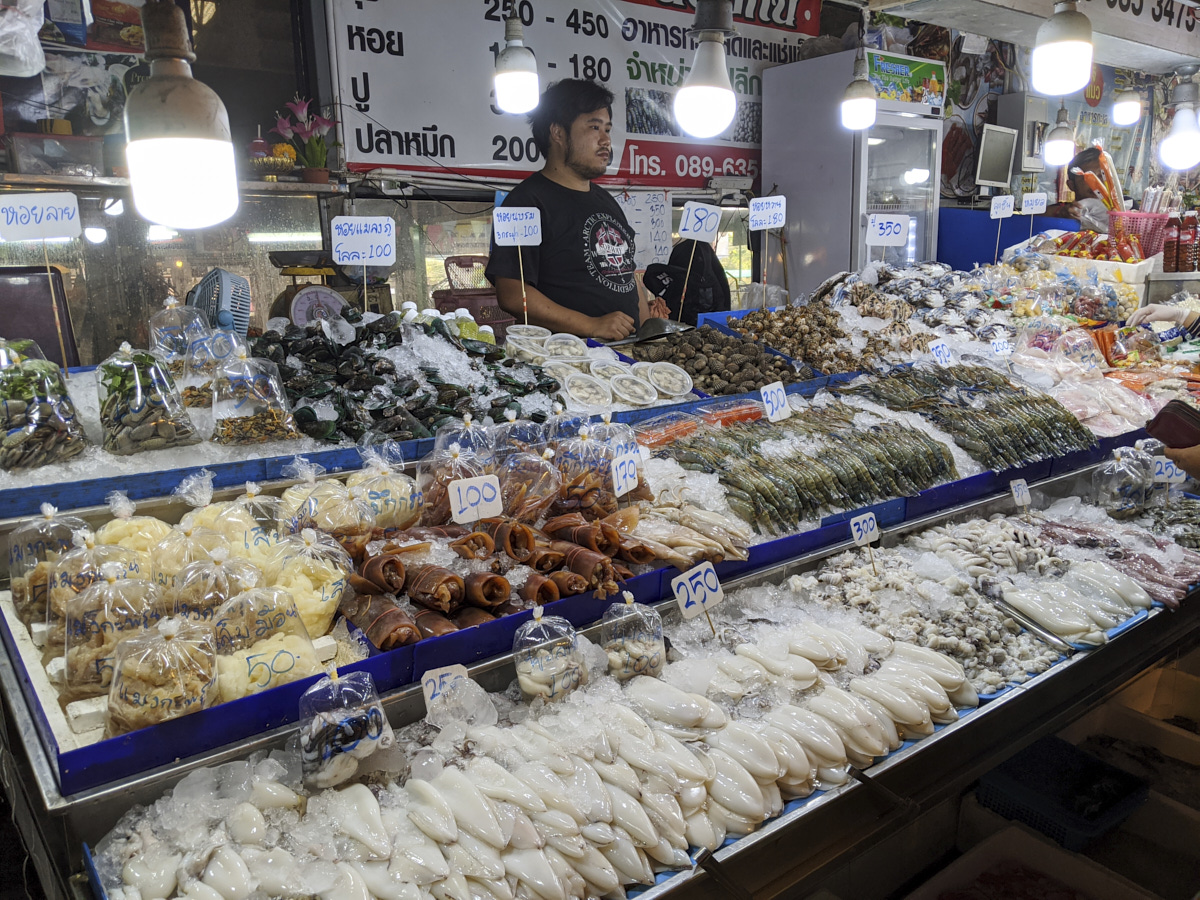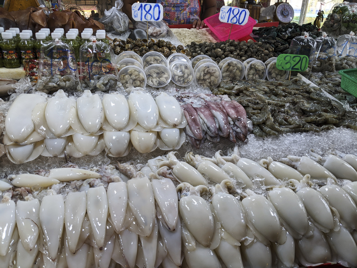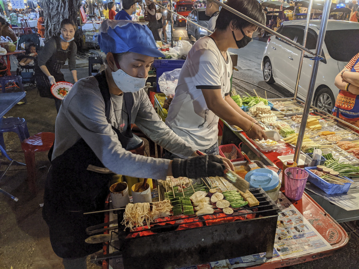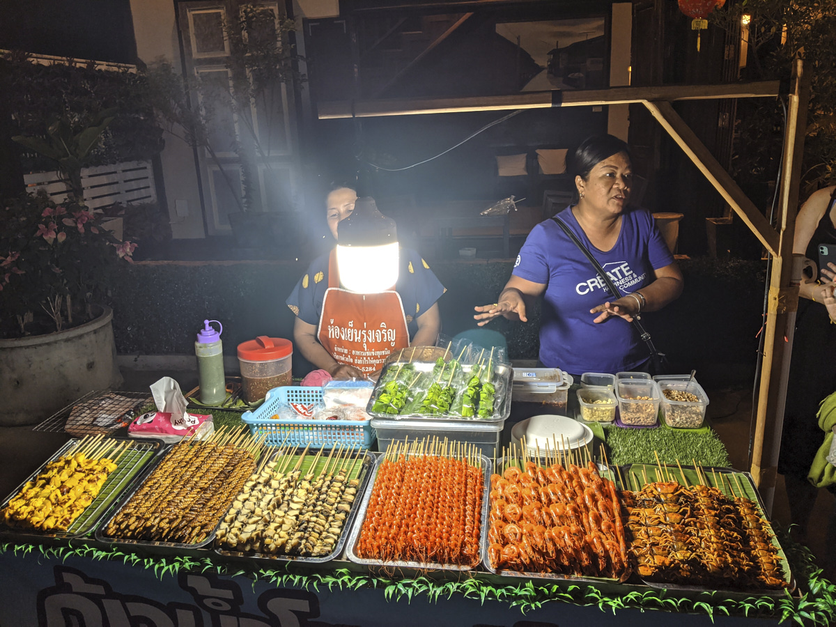 Next stop was Chiang Mai, where we spent a few days. The street food is wonderful, so many options. Squid on a stick, roasted chicken, corn on the cob, most any kind of meat or vegetable. Tim found a little stand where you pick out whatever skewers of food you like – mushrooms, meats, vegetables, then they are grilled on the spot.