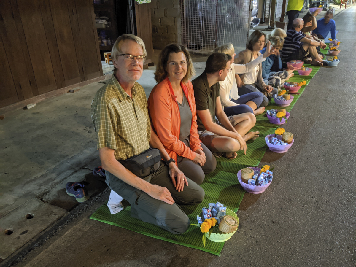 In this town, we had a chance to make offerings to the monks. The monks walk through the town very early each morning, collecting food and other gifts from the townspeople. We provided them with food, water and some small household supplies, and were then given a blessing by them.